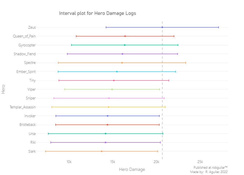 Effectively among 28 hero groups, we can see that there is a hero whose damage log confidence interval differs from others, this one is Zeus, and let’s explore his behavior overall.