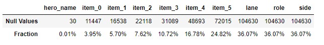 The columns with more NA values are the ones relative to the player position. In case of any comparison needed in terms of lane position, we will take another sample ensuring that we have a significant size to run our tests.