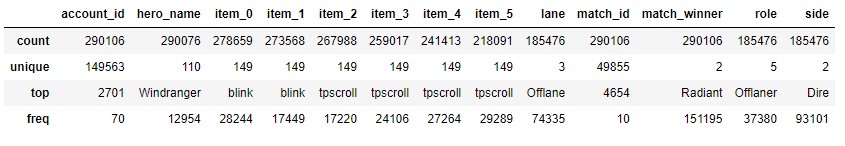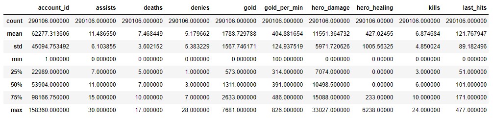 Almost every transformation was made on the preprocessing notebook, there you will encounter different blocs like the joins of hero descriptions, items used per session, and match outcomes to the main table of players’ registries. In the end, also will be a distribution study, to exclude outliers based on irregularities recorded on sessions (impossible values). Knowing this, we can say that the data is ready to go, so we can skip the Data Cleaning section. Here we are going to do an overall inspection.