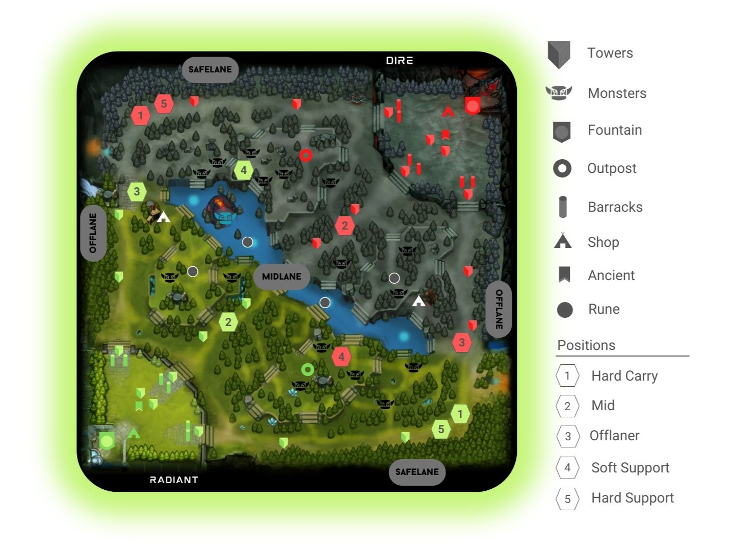 Level Designers: if the heroes are balanced in terms of damage, the damage dealt by the creeps will require an investigation, which depends on the design of the map lanes. They must hit a balance between creating easy or hard experiences, and this will rely on the creeps per lane. Another mapping issue that would need to address is the jungle, which is typically filled with creeps that players can kill for rewards, which the designers require to define how challenging they should be to defeat.